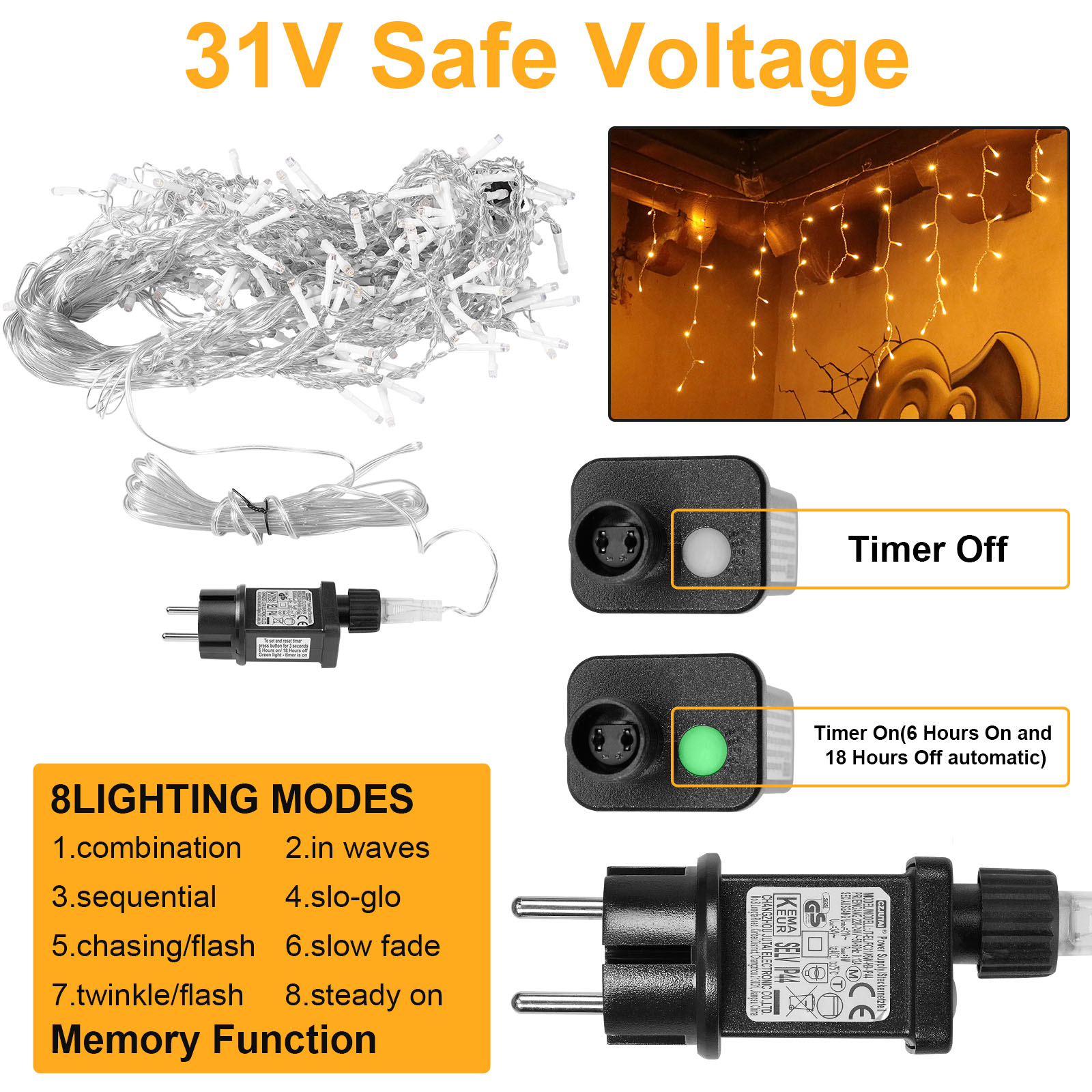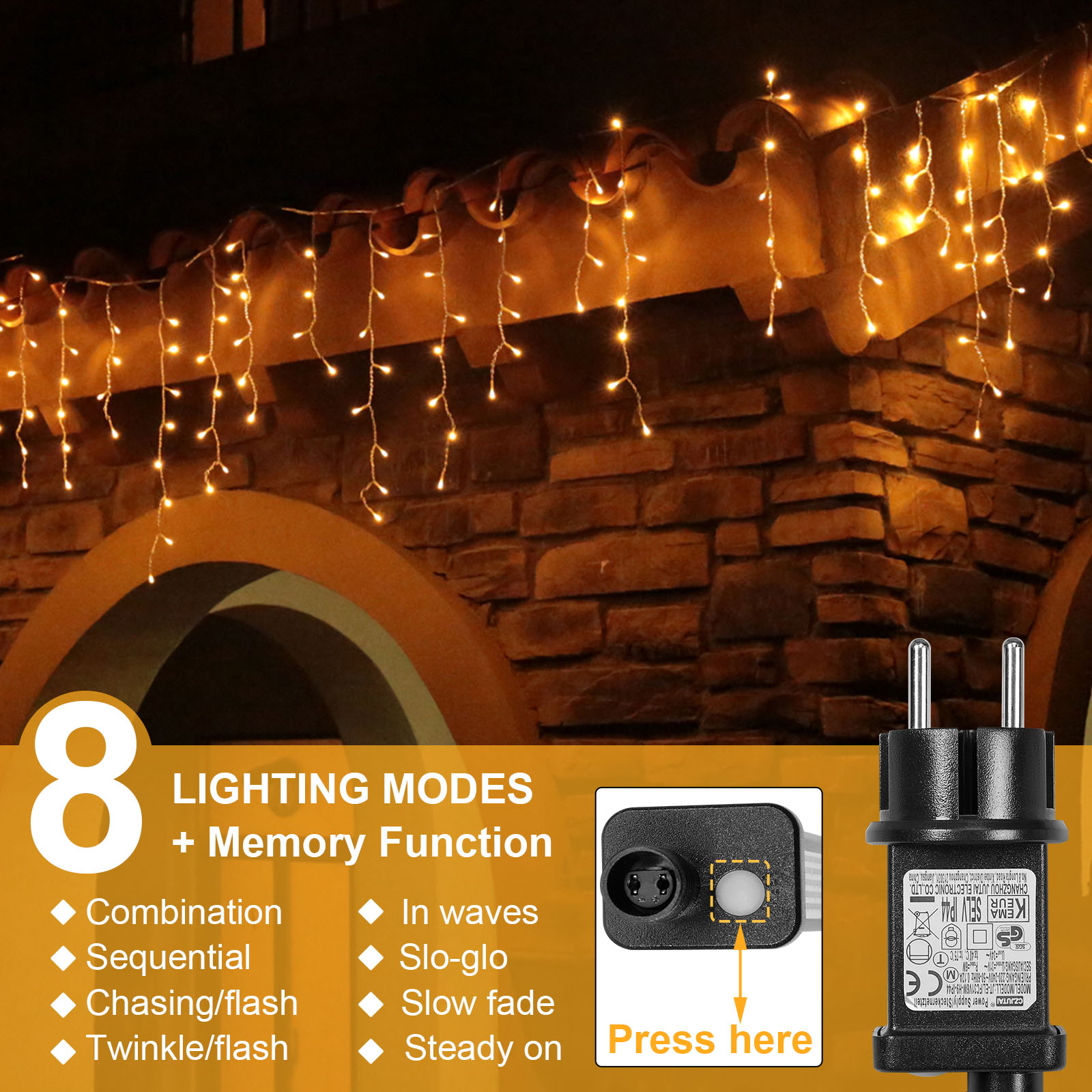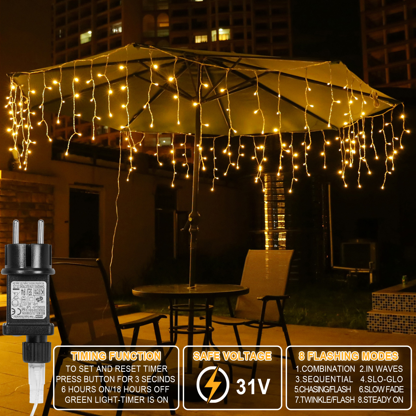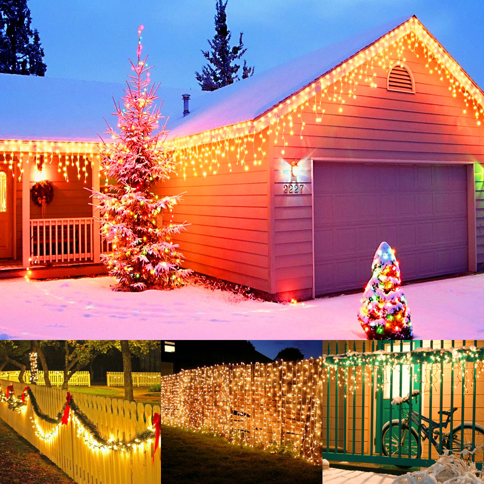 Guirnalda de luces LED para carámbano de 5M/10M/15M con cable de plomo de 5M/16,4 pies Función de memoria de bajo voltaje Temporizador de 8 modos Luces navideñas para carámbano impermeables Luces de carámbano para interiores y exteriores para decoraciones navideñas y bodas