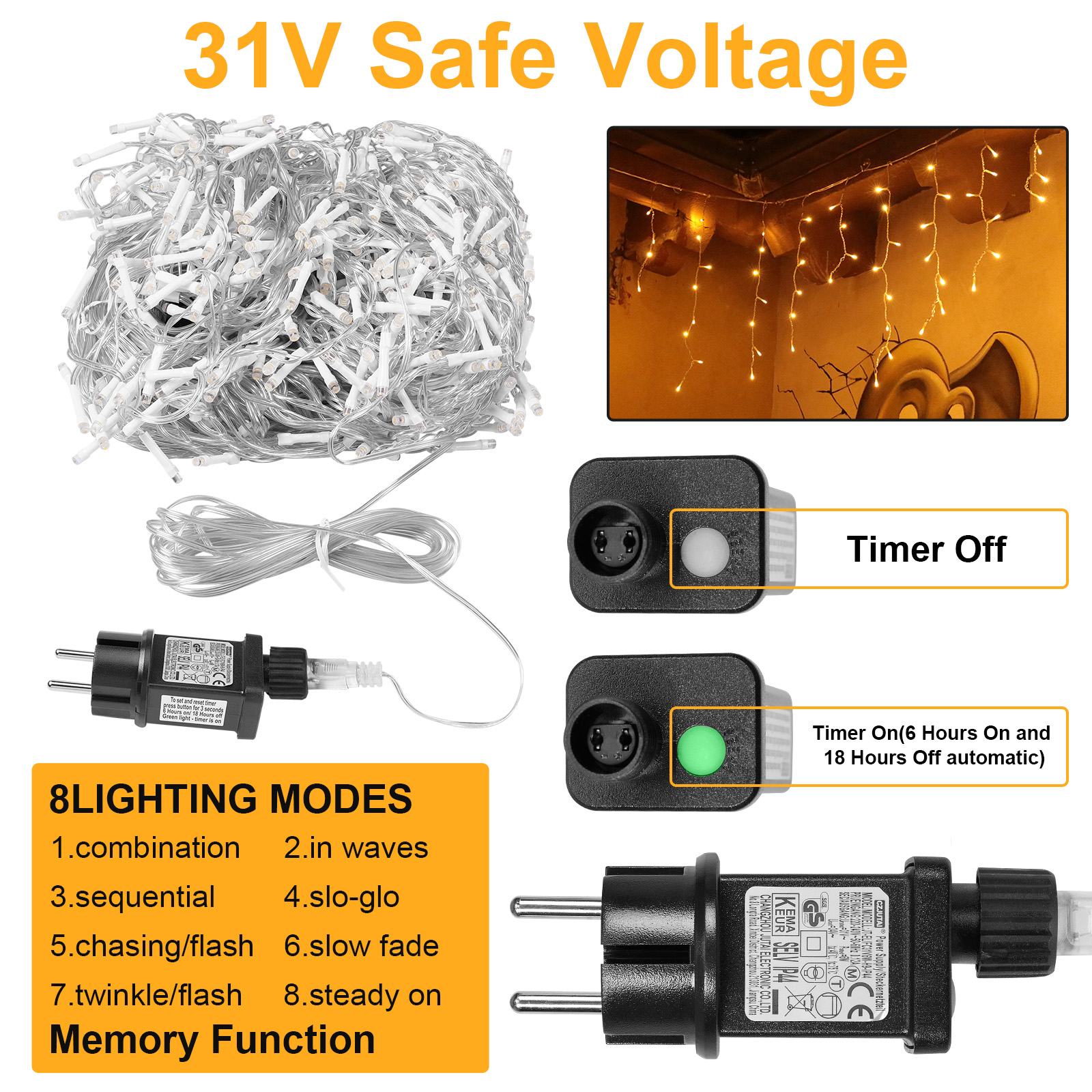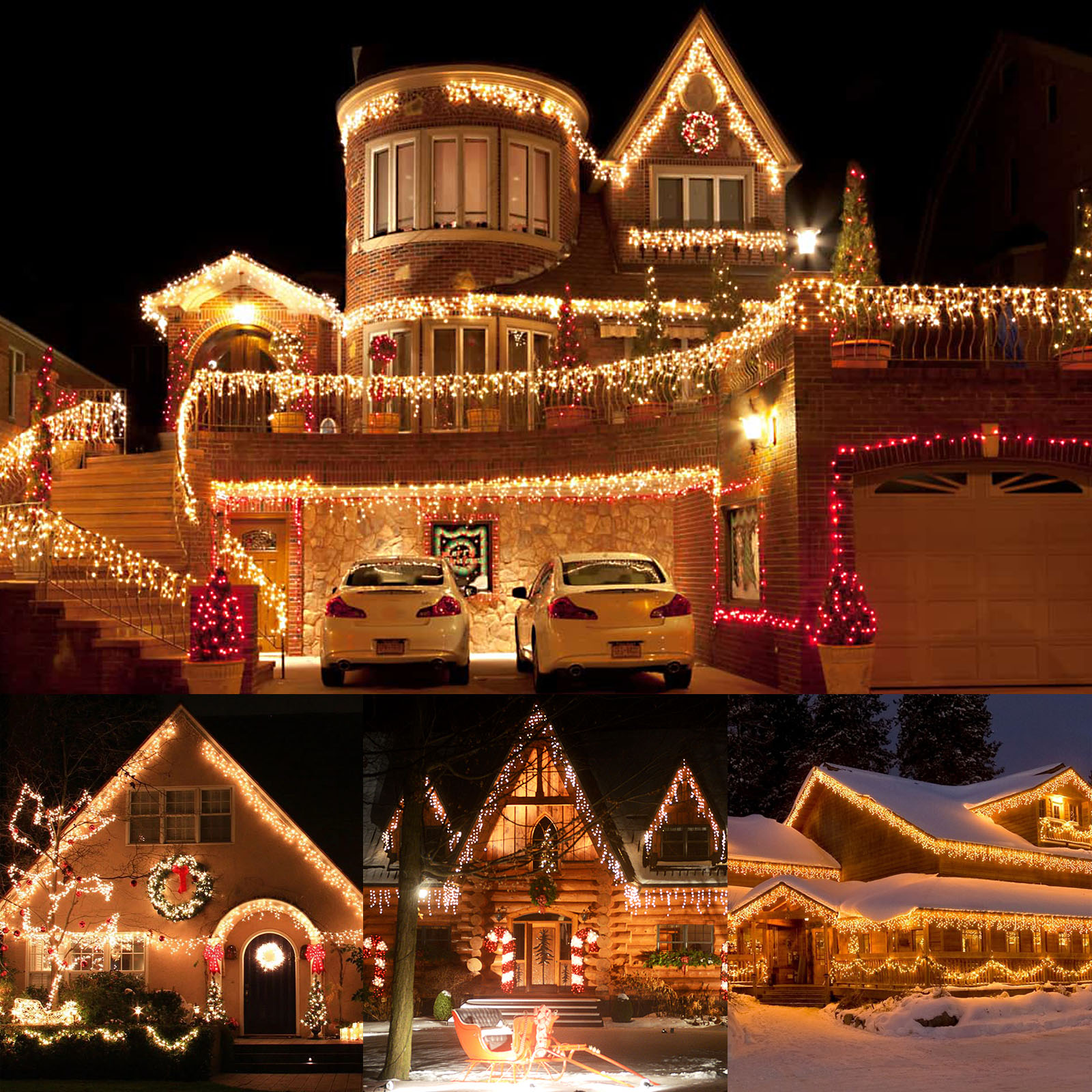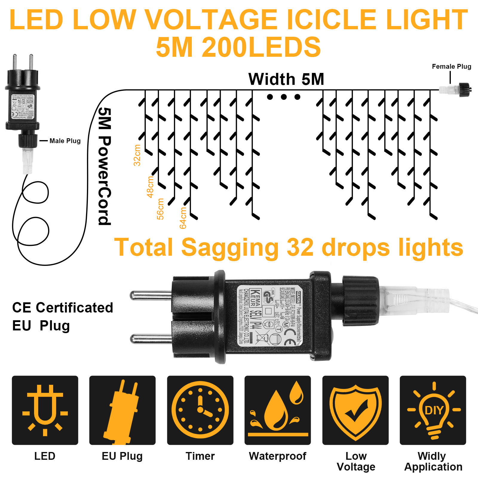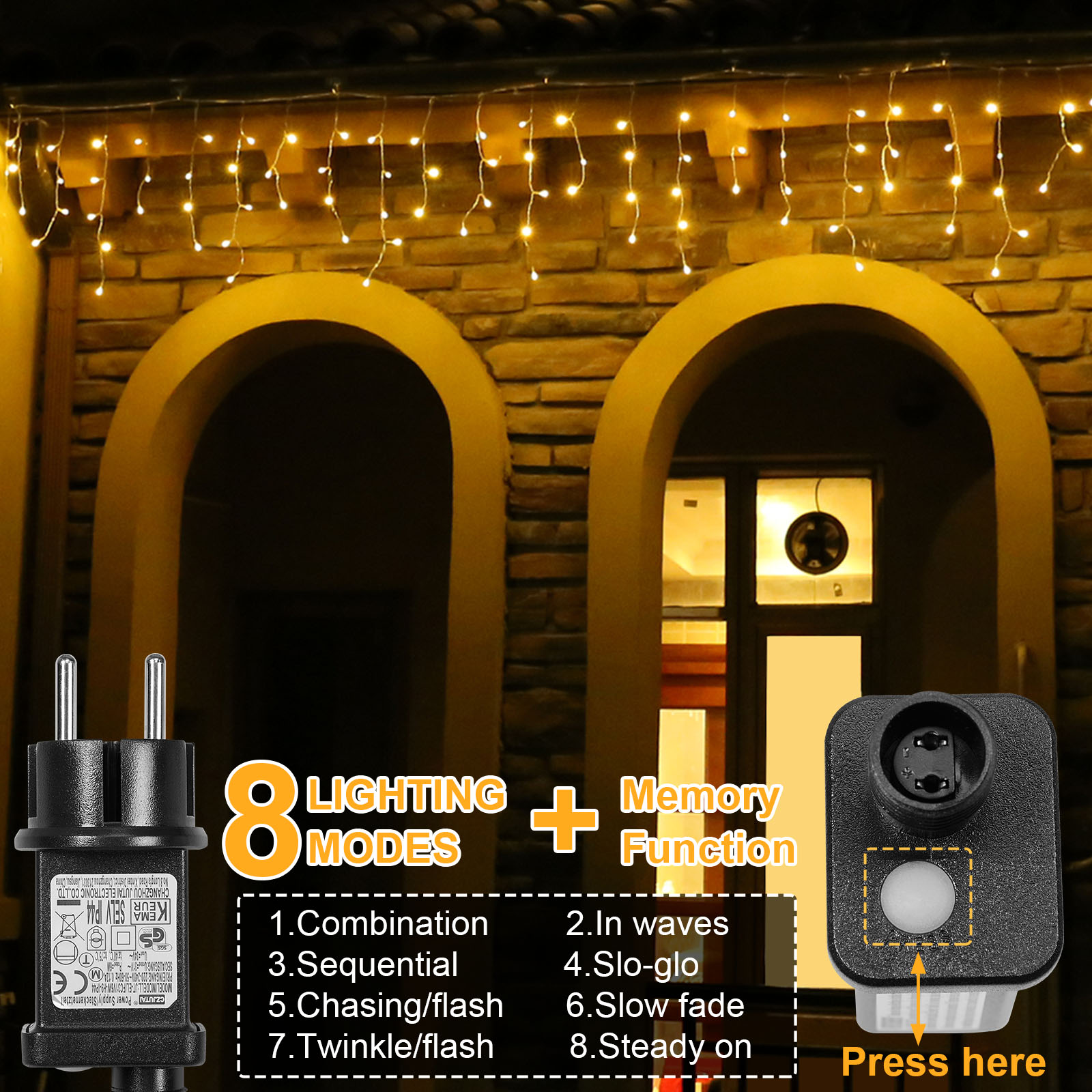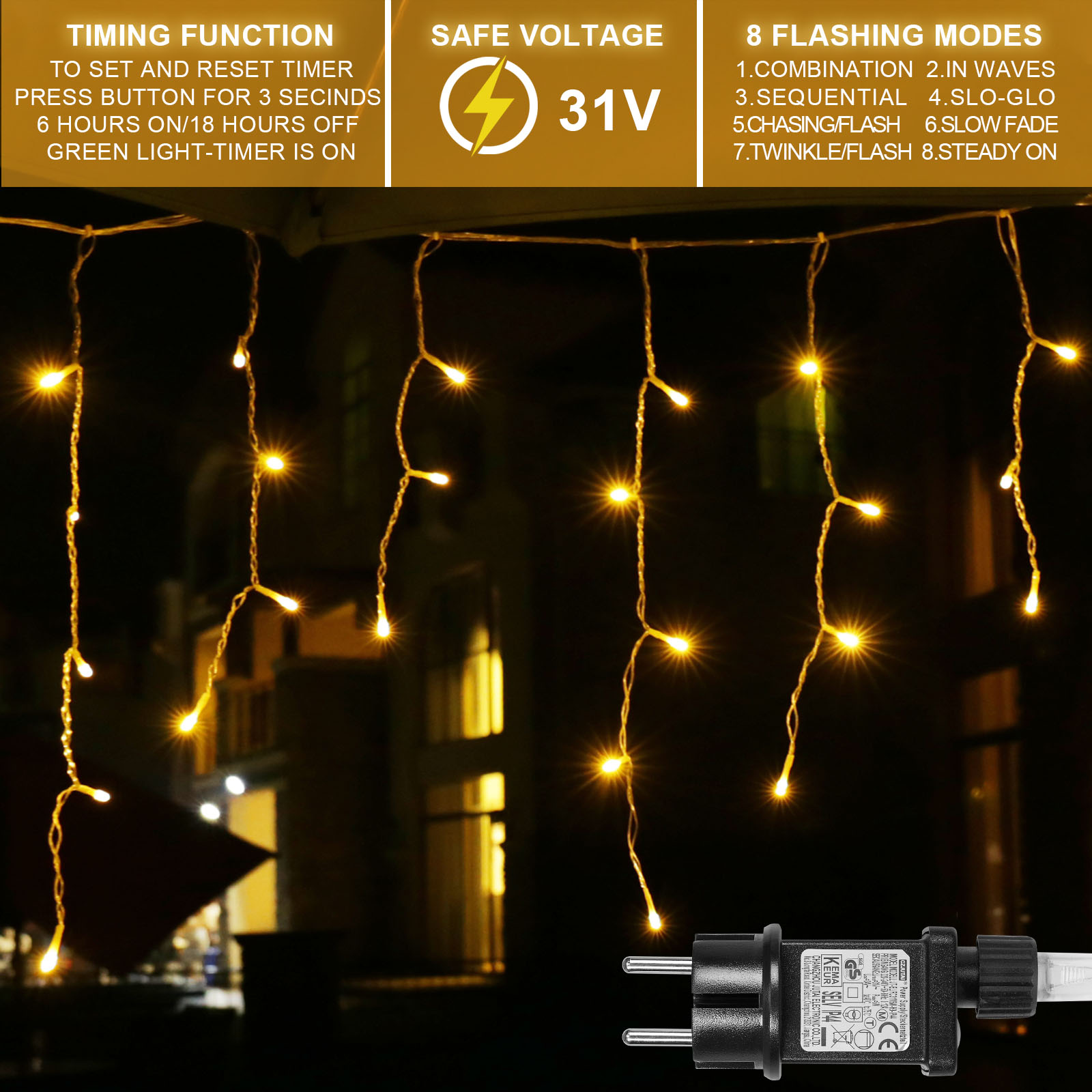 Guirnalda de luces LED para carámbano de 5M/10M/15M con cable de plomo de 5M/16,4 pies Función de memoria de bajo voltaje Temporizador de 8 modos Luces navideñas para carámbano impermeables Luces de carámbano para interiores y exteriores para decoraciones navideñas y bodas