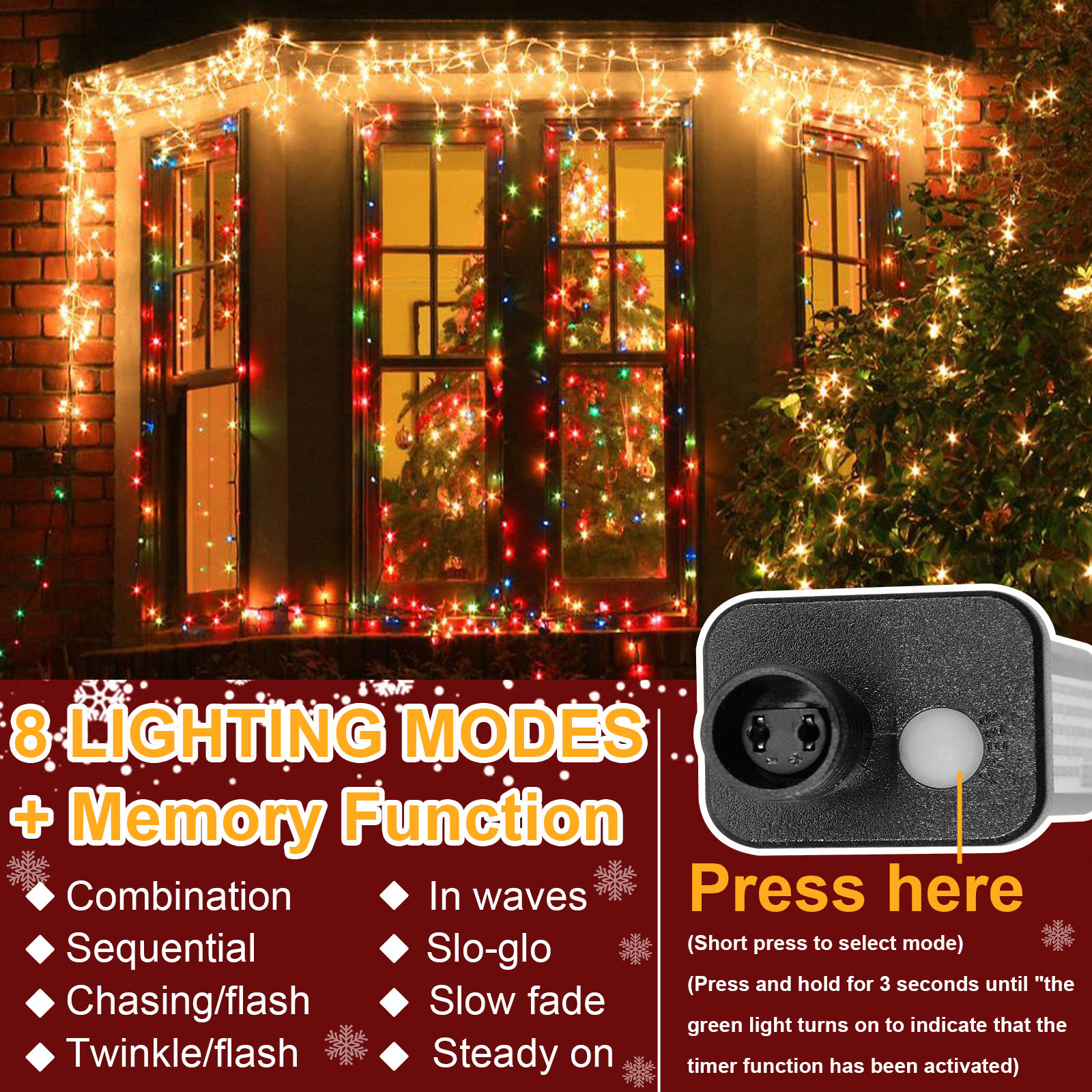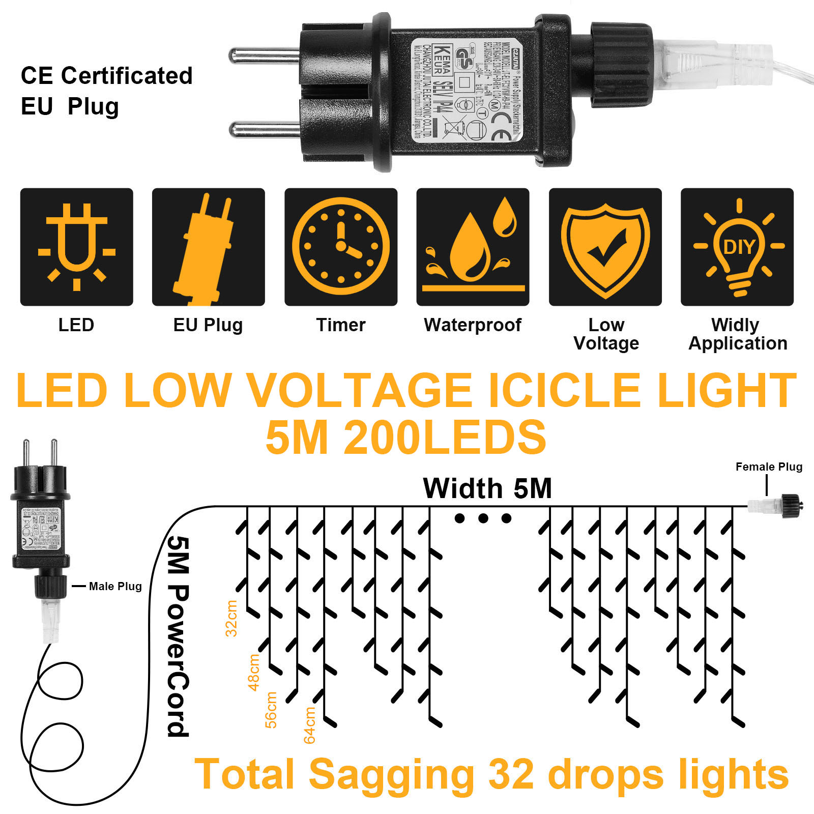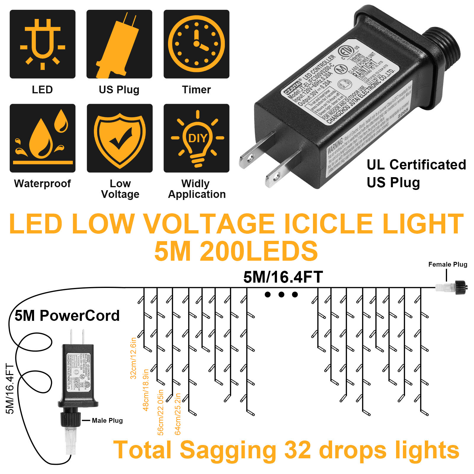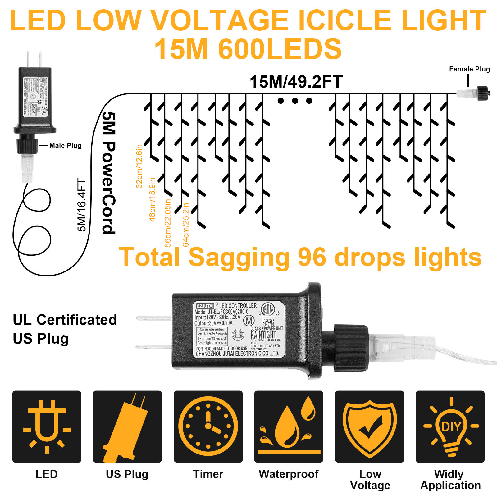 Guirnalda de luces LED para carámbano de 5M/10M/15M con cable de plomo de 5M/16,4 pies Función de memoria de bajo voltaje Temporizador de 8 modos Luces navideñas para carámbano impermeables Luces de carámbano para interiores y exteriores para decoraciones navideñas y bodas
