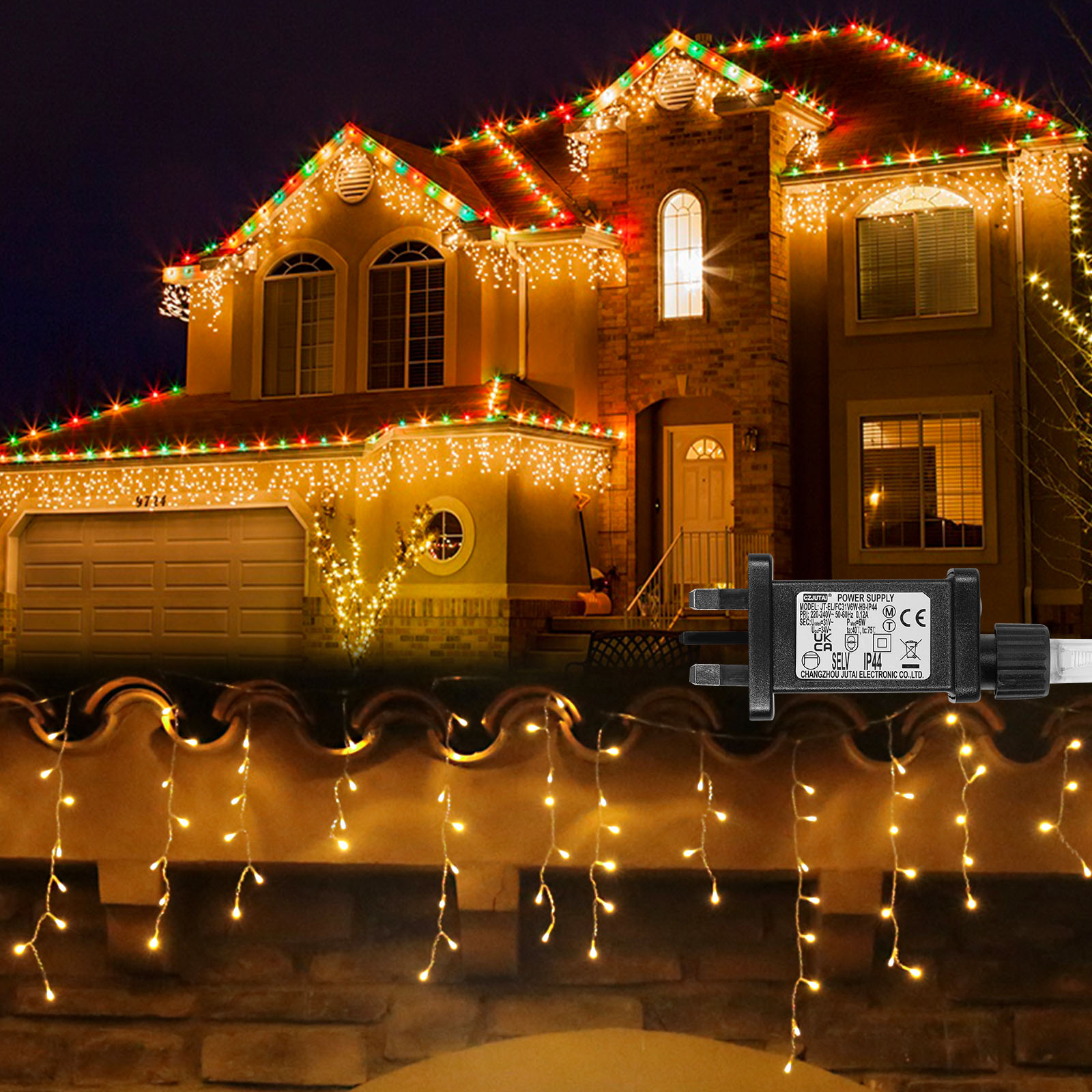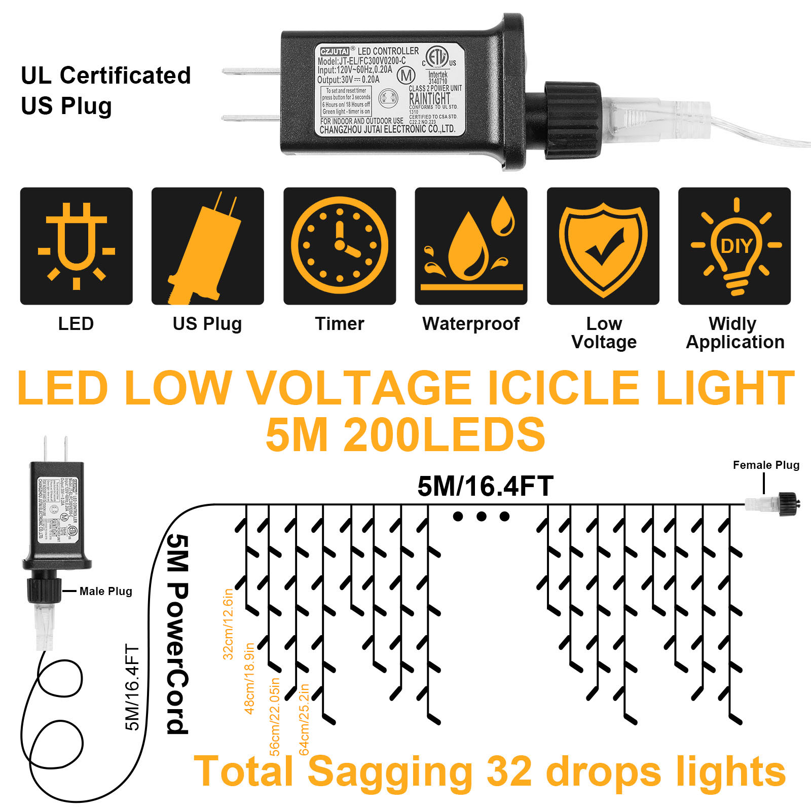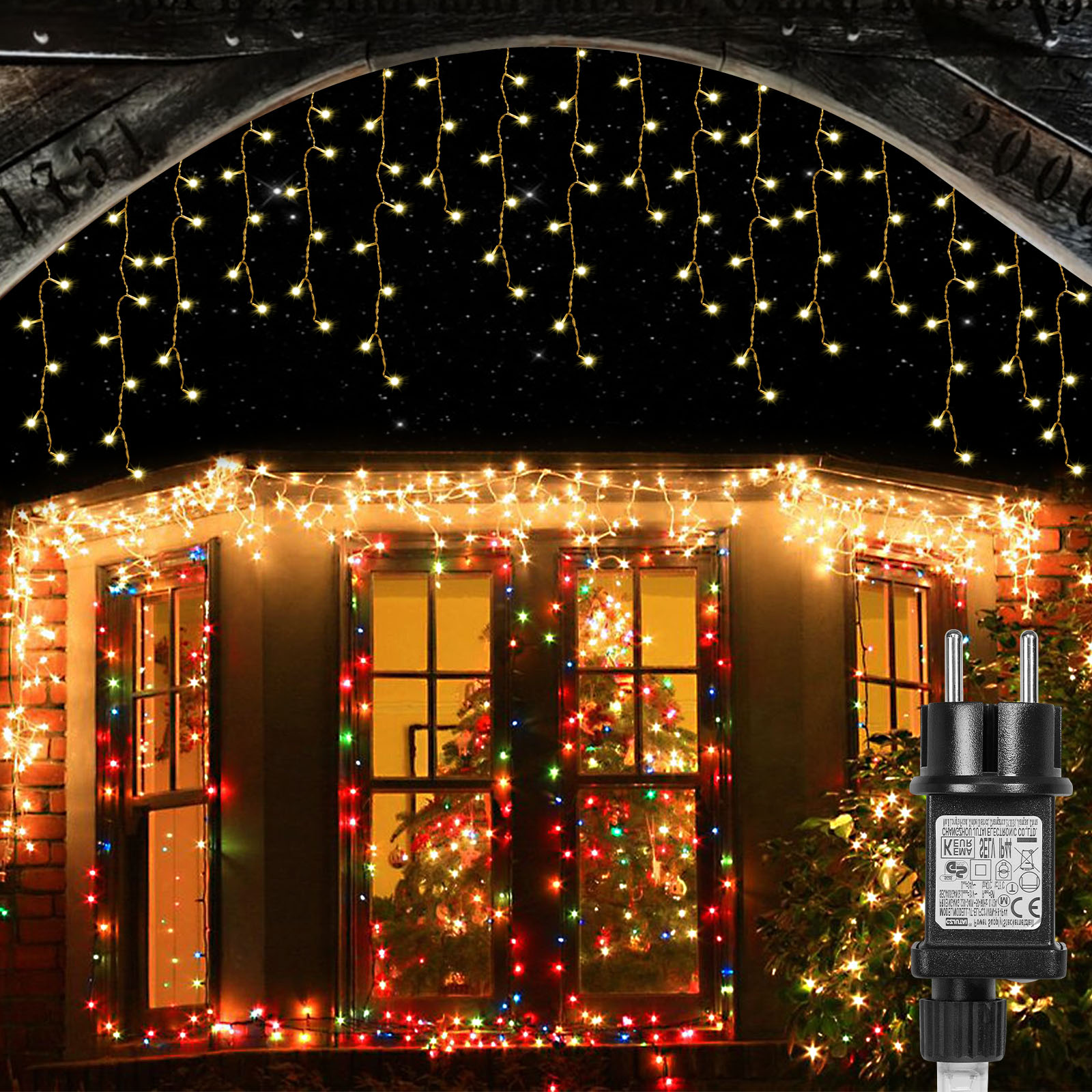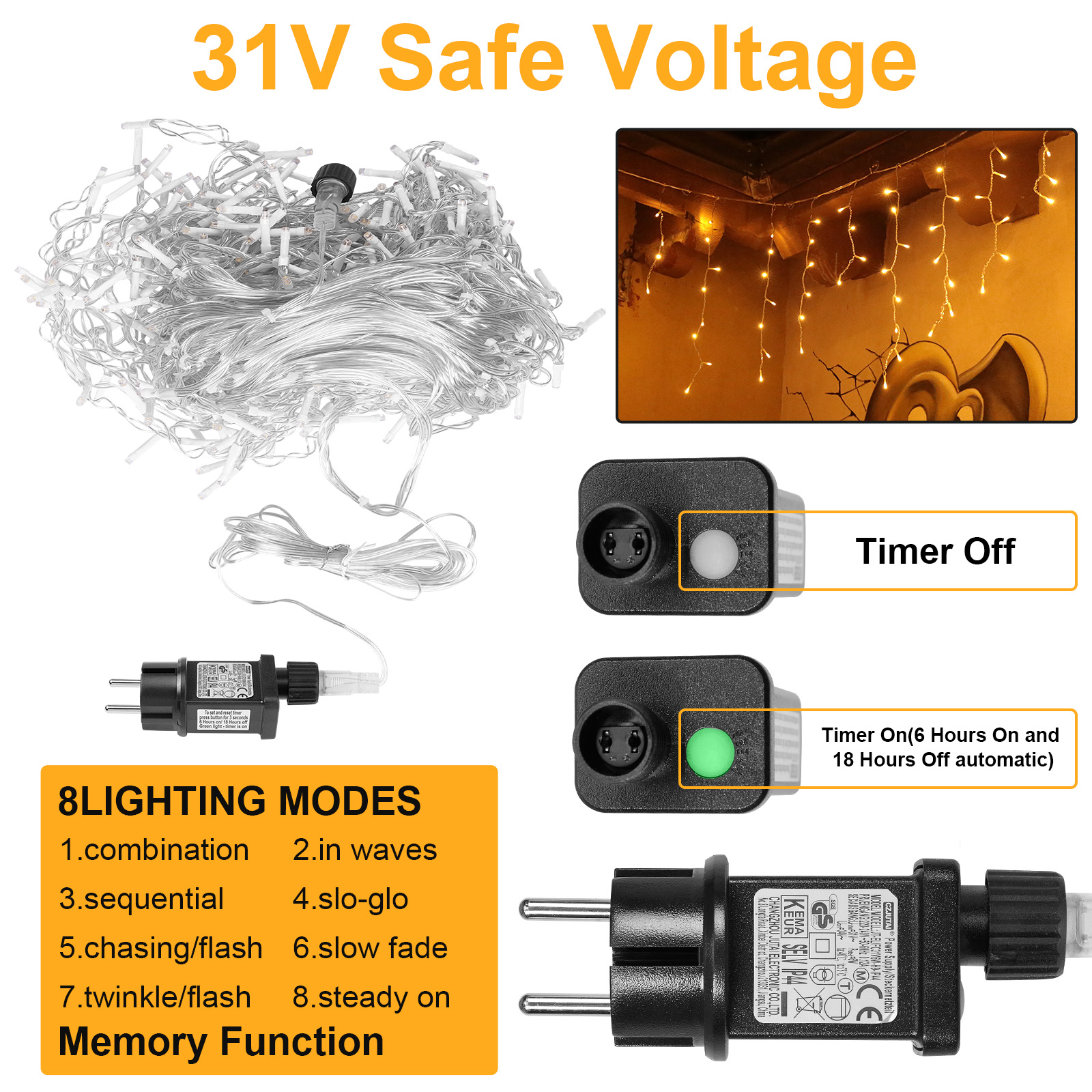 Guirnalda de luces LED para carámbano de 5M/10M/15M con cable de plomo de 5M/16,4 pies Función de memoria de bajo voltaje Temporizador de 8 modos Luces navideñas para carámbano impermeables Luces de carámbano para interiores y exteriores para decoraciones navideñas y bodas