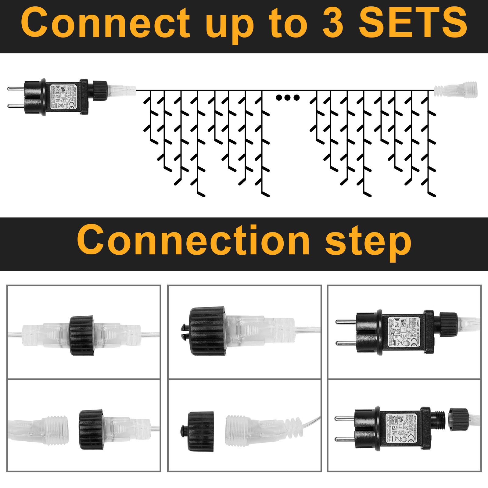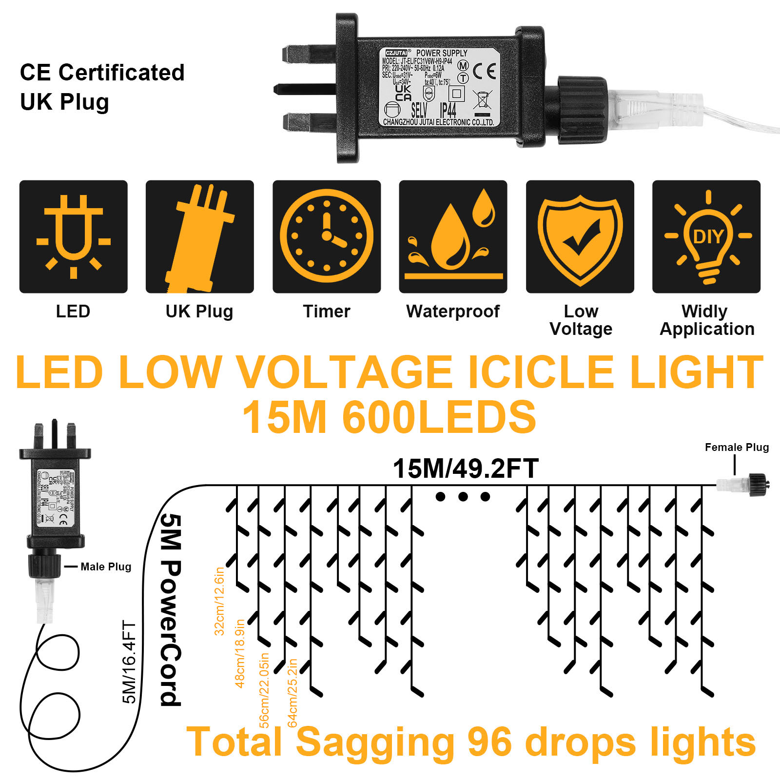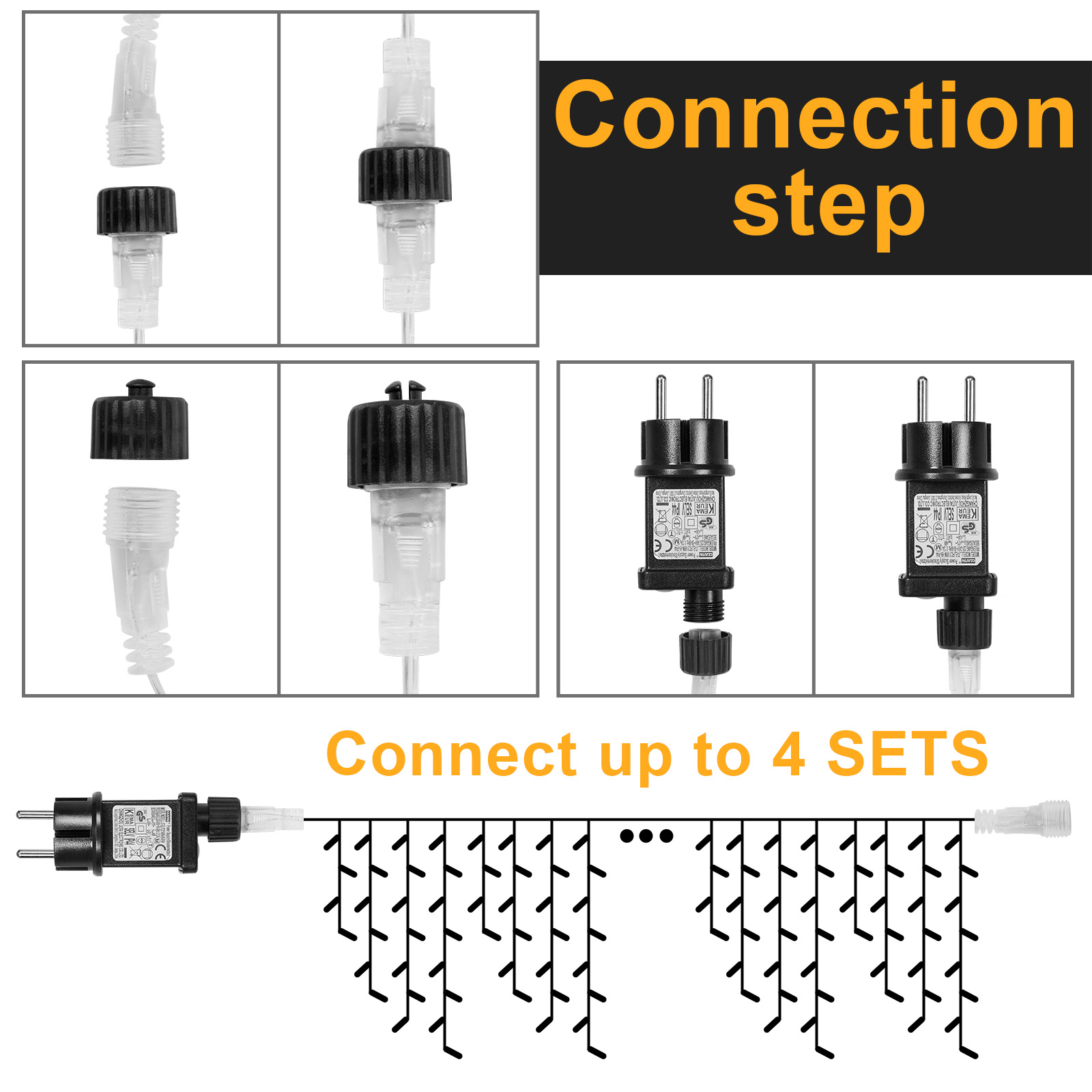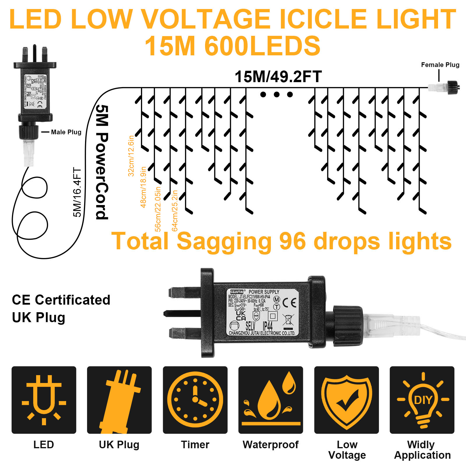 * Cadena súper larga y cable de alimentación: esta cadena de luces LED para carámbanos con 5 M (16,4 pies)/10 M (32,8 pies) de longitud de cadena larga de 15 M (49,2 pies) y cable de alimentación de 5 M/16,4 pies de largo, fácil de usar, Adecuado para casi todas las ventanas o casas de altura normal.Modelo de 5 M/16,4 pies con 32 caídas y 200 LED, modelo de 10 M/32,8 pies con 64 gotas y 400 LED, modelo de 15 M/49,2 pies con 96 gotas y 600 LED.