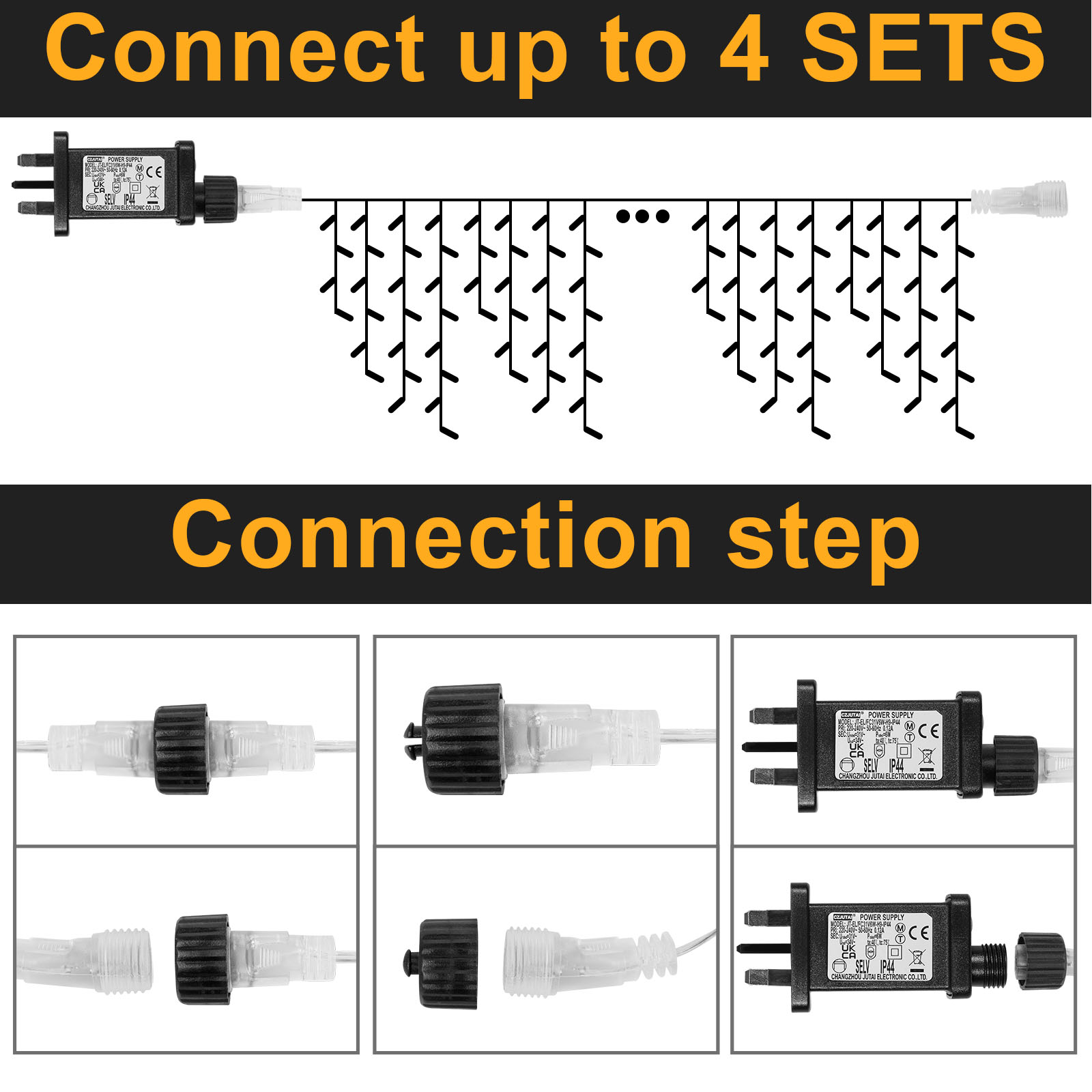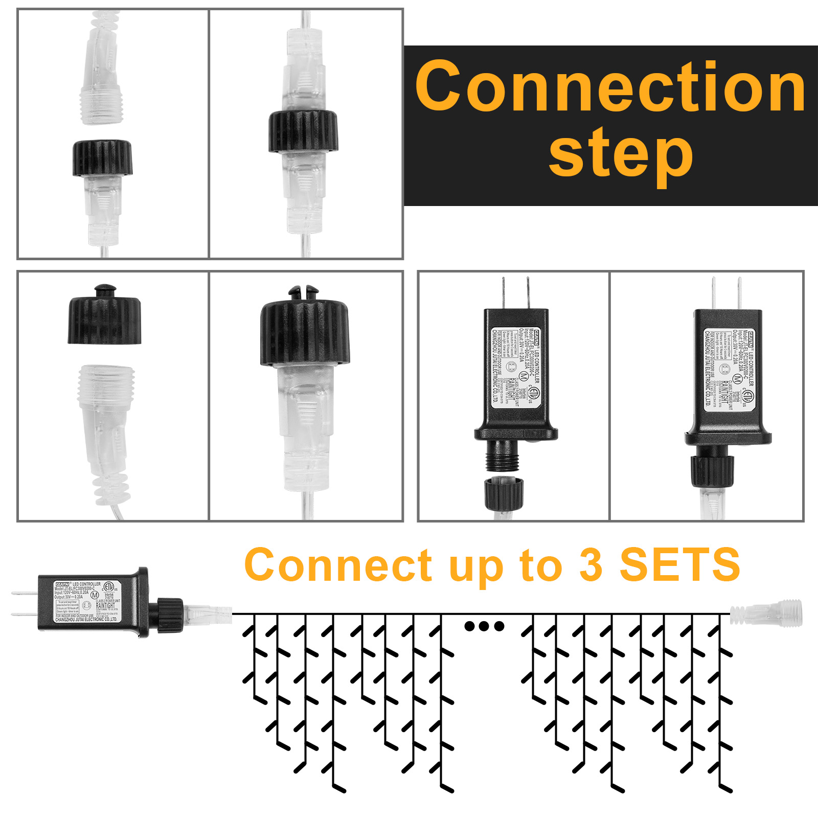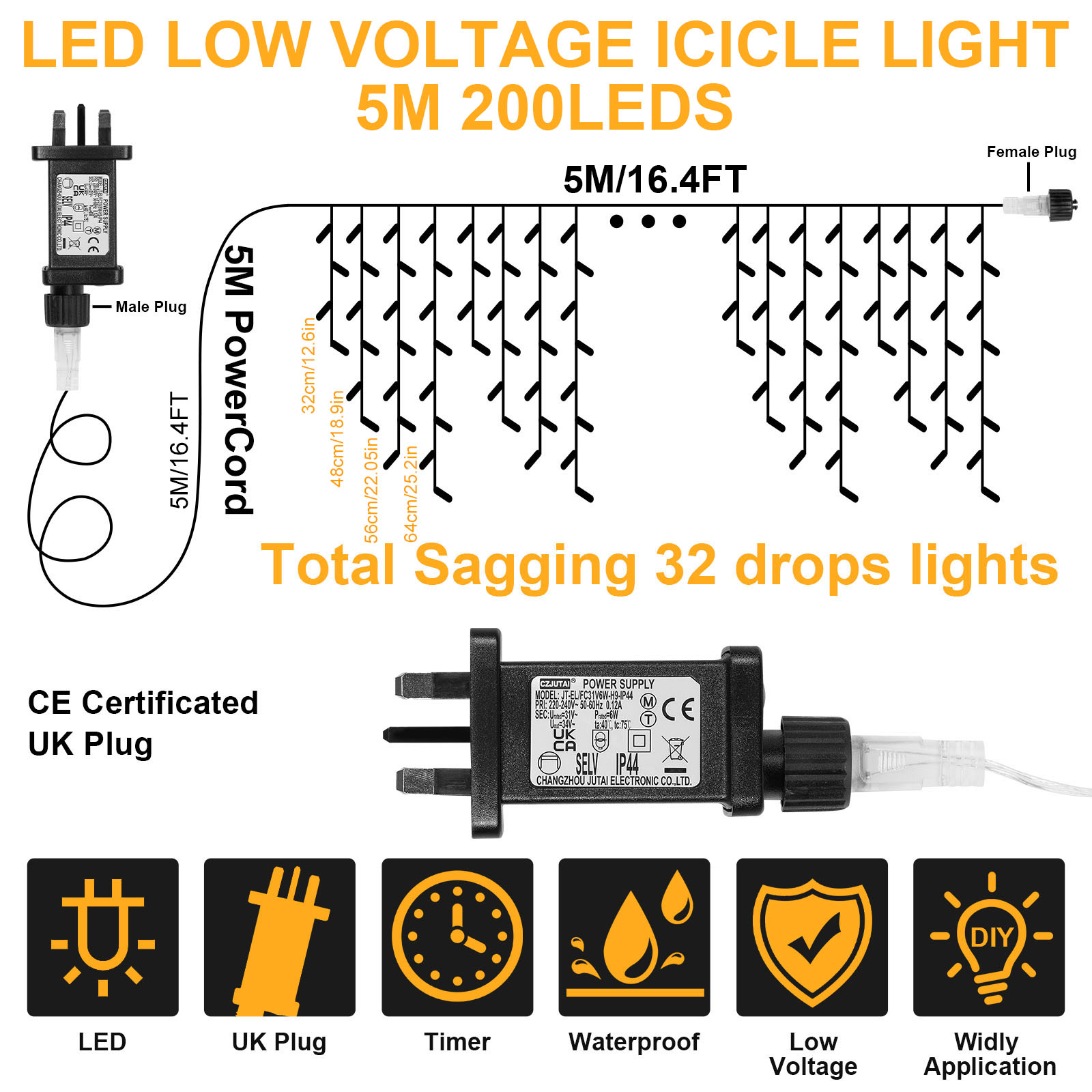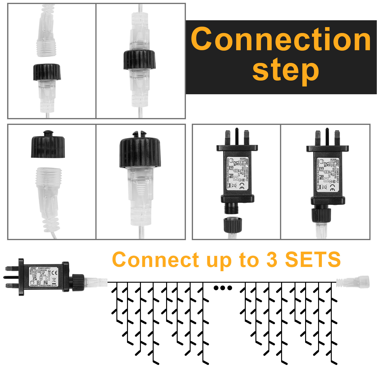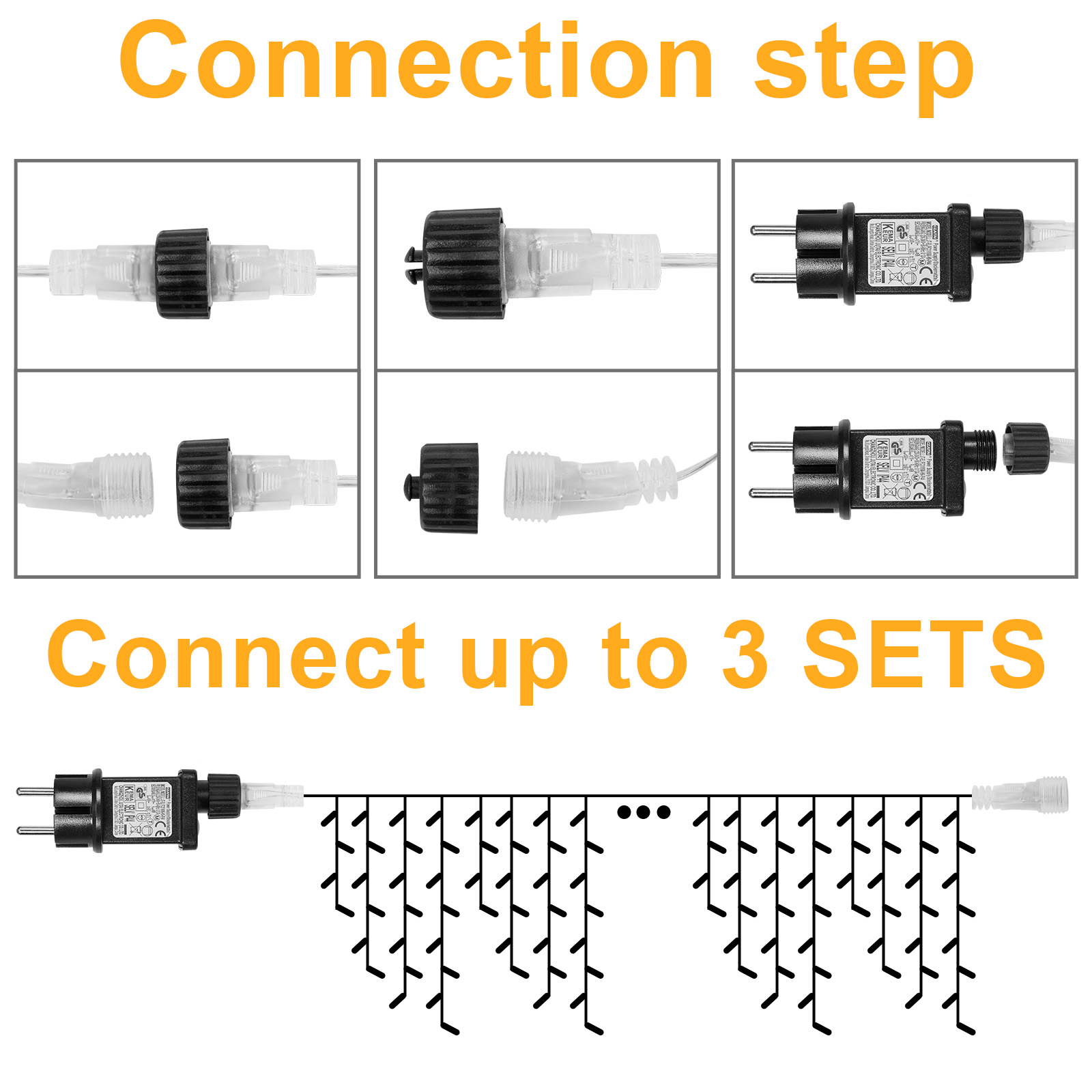 * Cadena súper larga y cable de alimentación: esta cadena de luces LED para carámbanos con 5 M (16,4 pies)/10 M (32,8 pies) de longitud de cadena larga de 15 M (49,2 pies) y cable de alimentación de 5 M/16,4 pies de largo, fácil de usar, Adecuado para casi todas las ventanas o casas de altura normal.Modelo de 5 M/16,4 pies con 32 caídas y 200 LED, modelo de 10 M/32,8 pies con 64 gotas y 400 LED, modelo de 15 M/49,2 pies con 96 gotas y 600 LED.