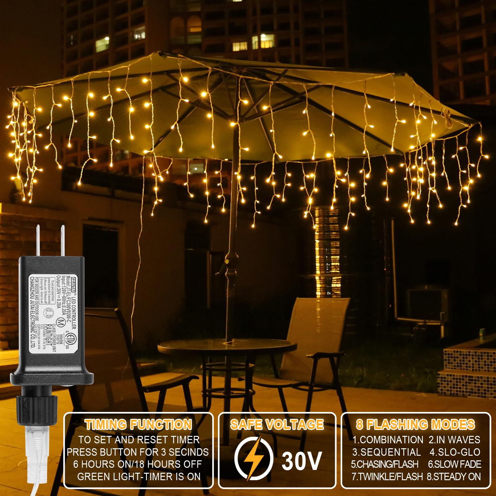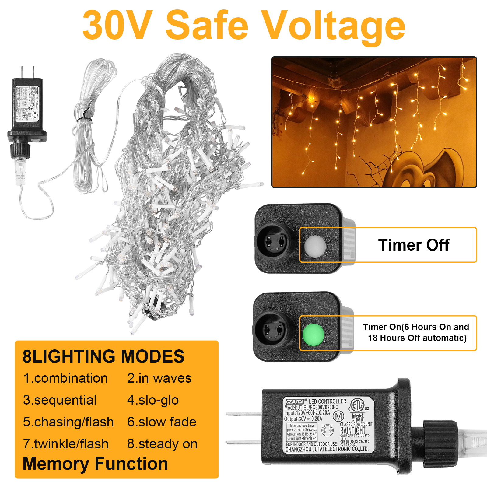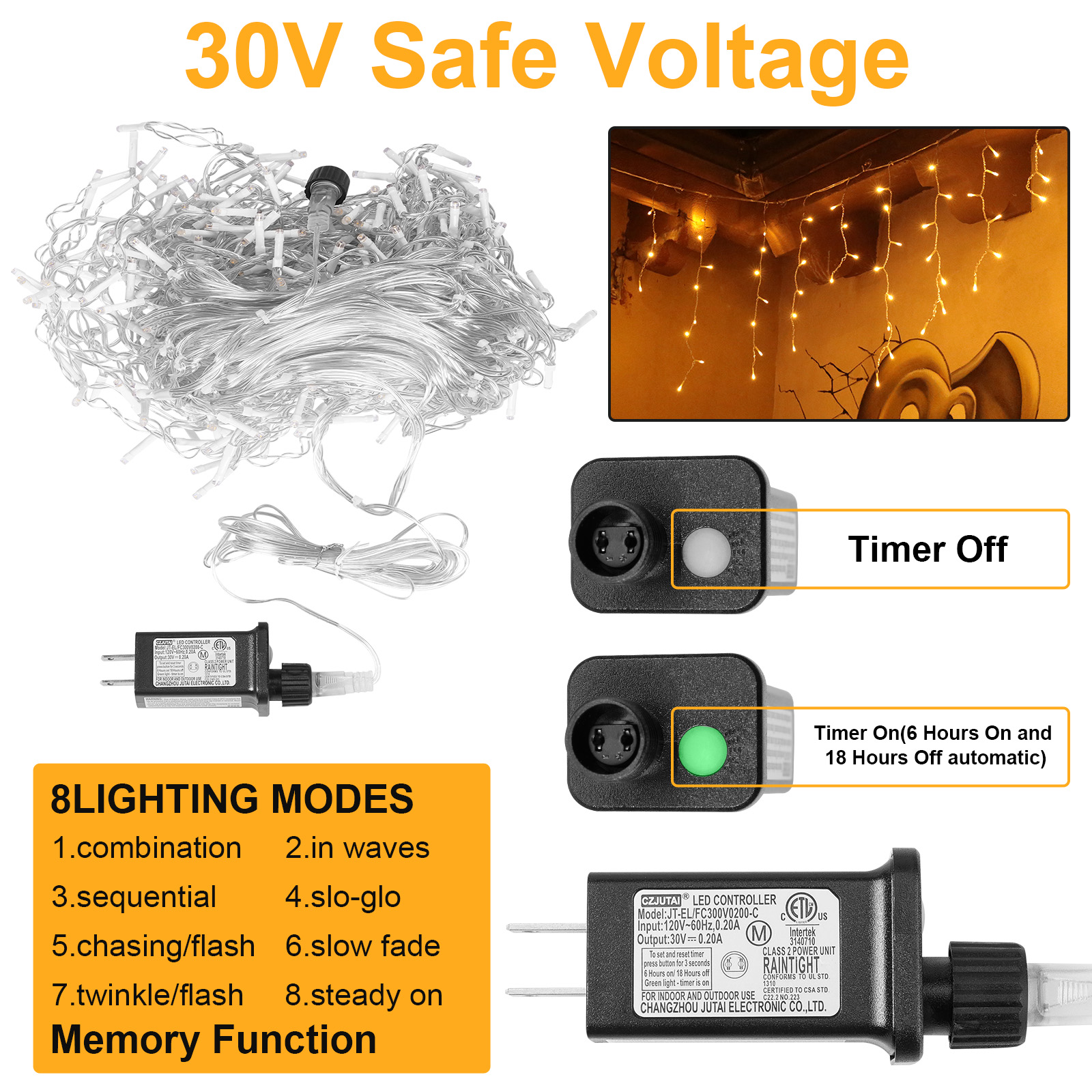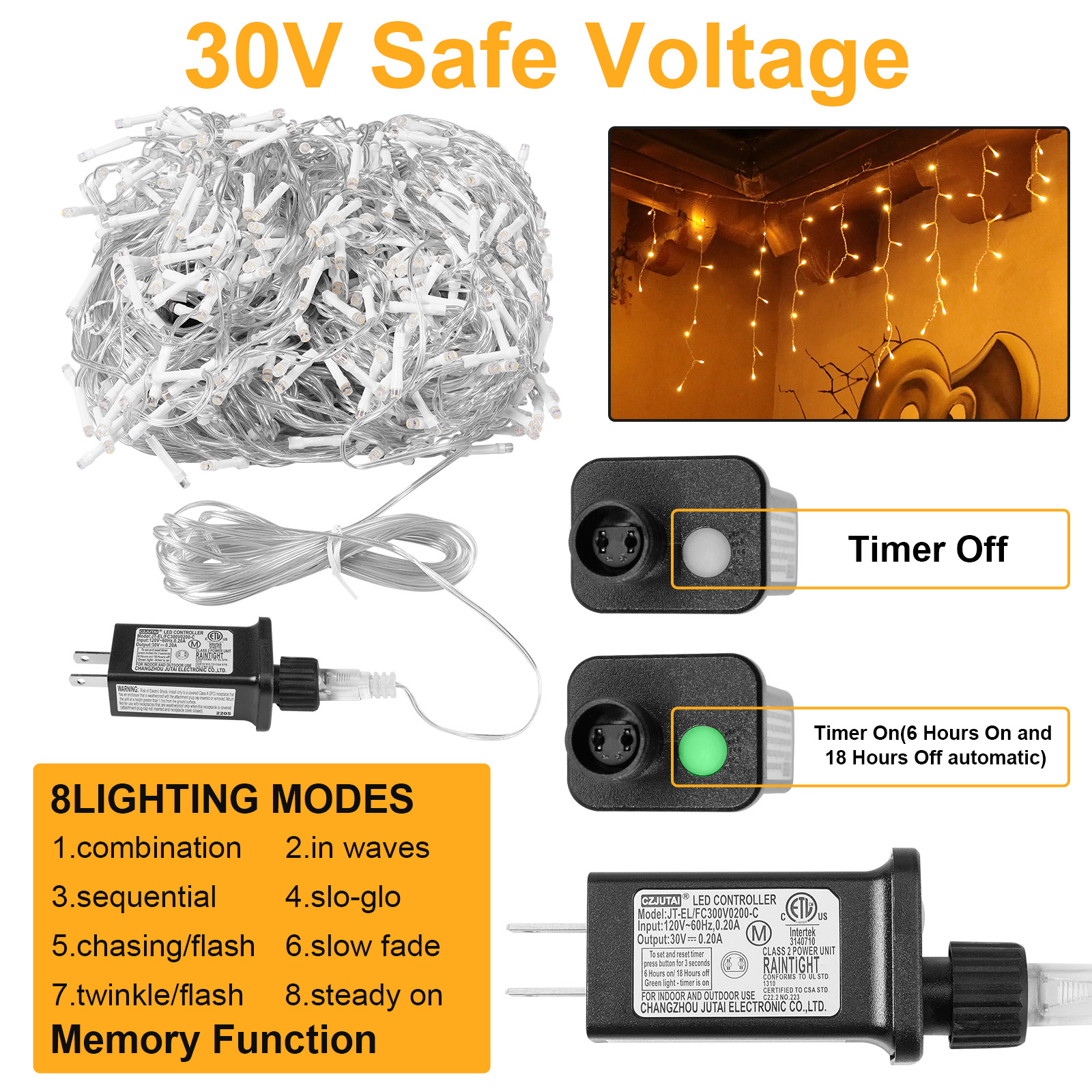 * Función de temporizador: las luces de cadena de carámbanos vienen con función de temporizador: 8 horas encendidas y 16 horas apagadas.Mantenga presionado 3 segundos hasta que se encienda la iluminación verde del botón, lo que significa que el temporizador está activado; Si la luz verde está apagada significa que el cronómetro está inactivado.