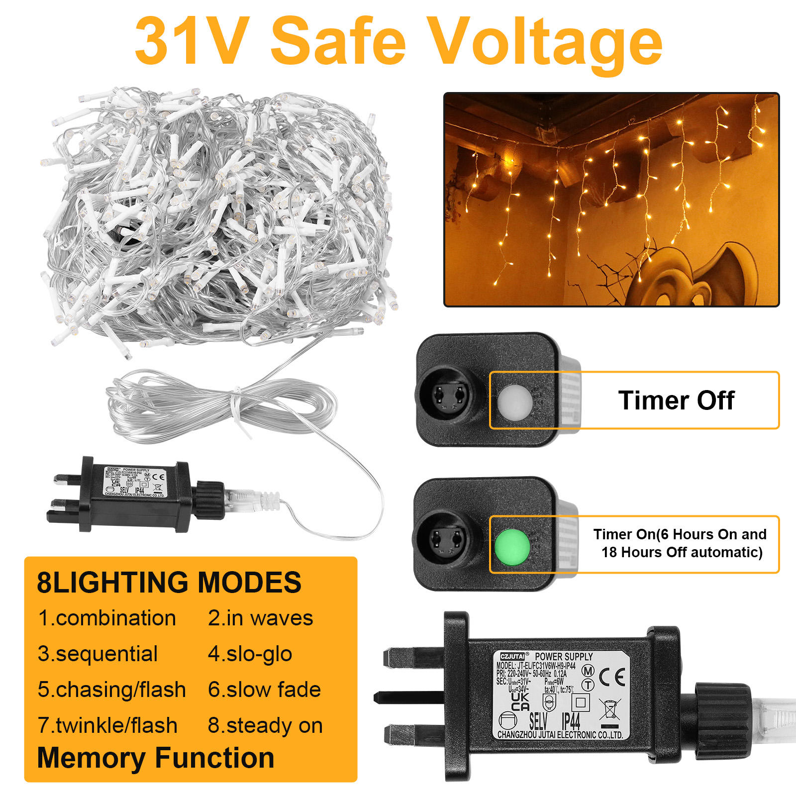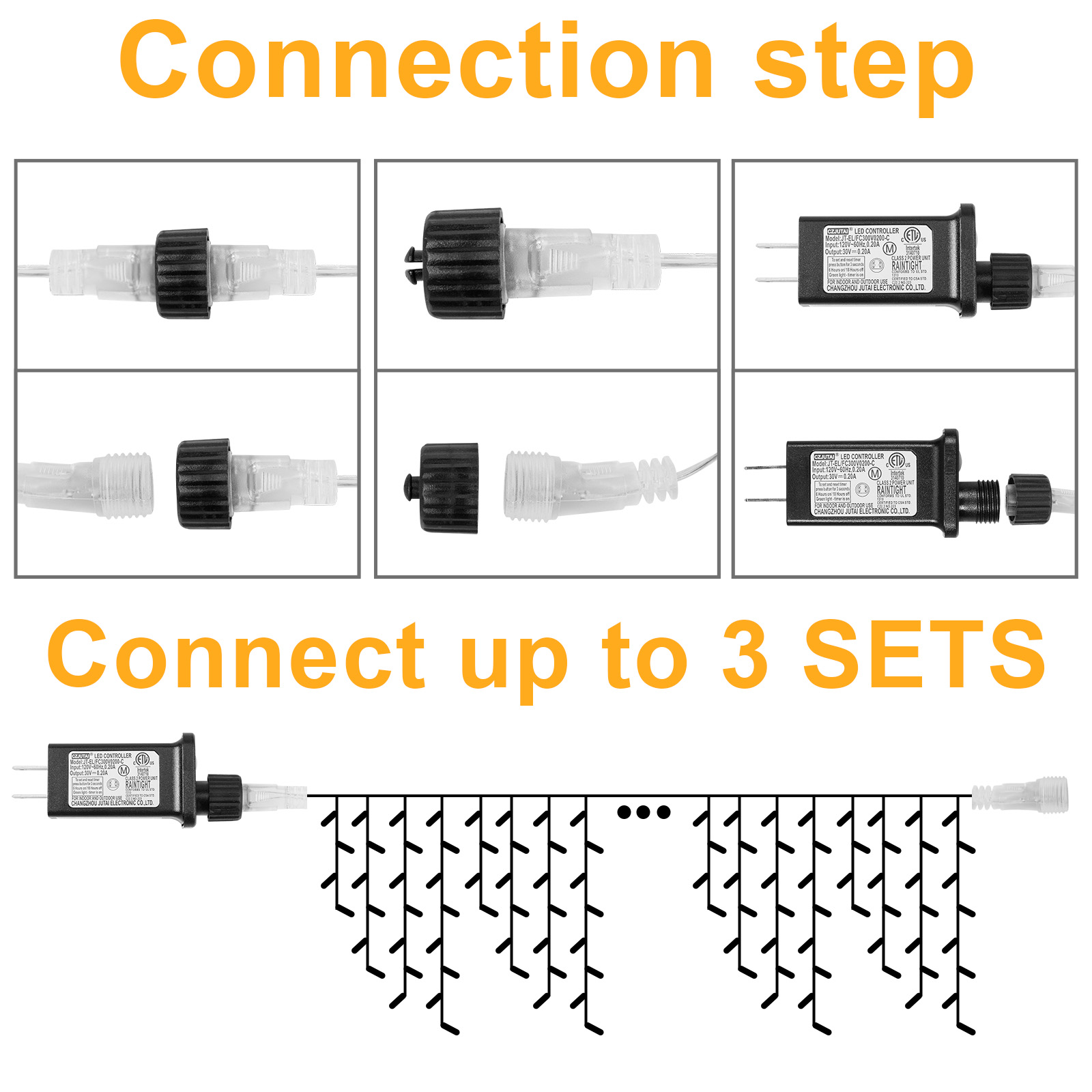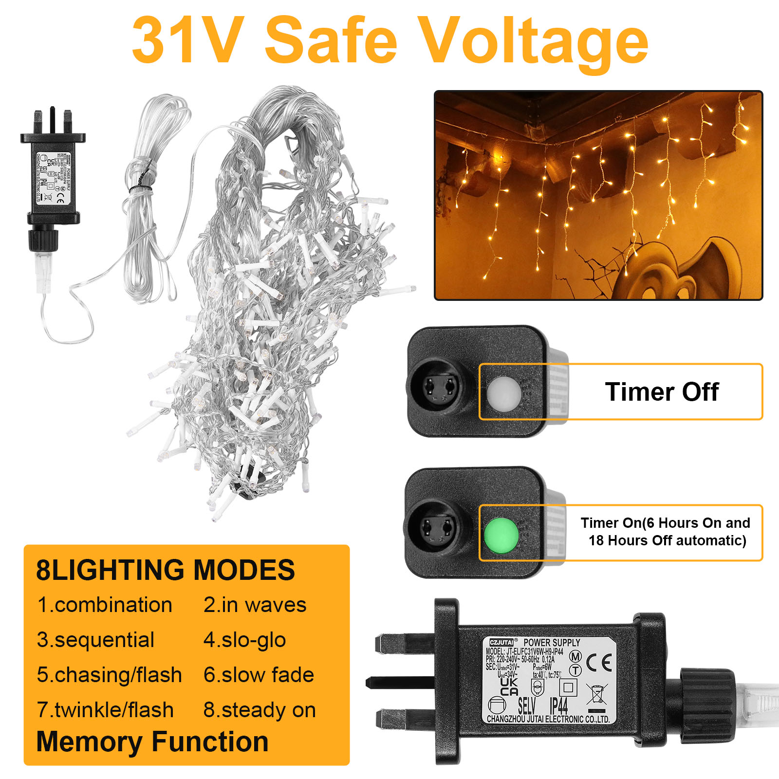 * Función de temporizador: las luces de cadena de carámbanos vienen con función de temporizador: 8 horas encendidas y 16 horas apagadas.Mantenga presionado 3 segundos hasta que se encienda la iluminación verde del botón, lo que significa que el temporizador está activado; Si la luz verde está apagada significa que el cronómetro está inactivado.