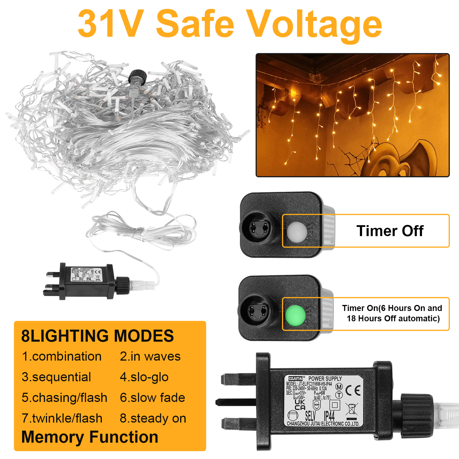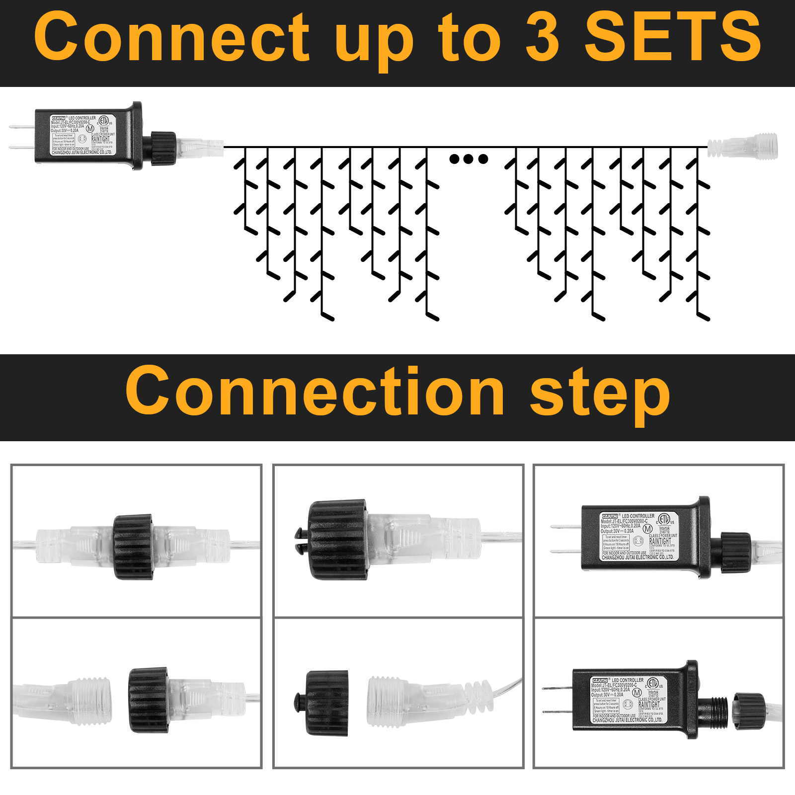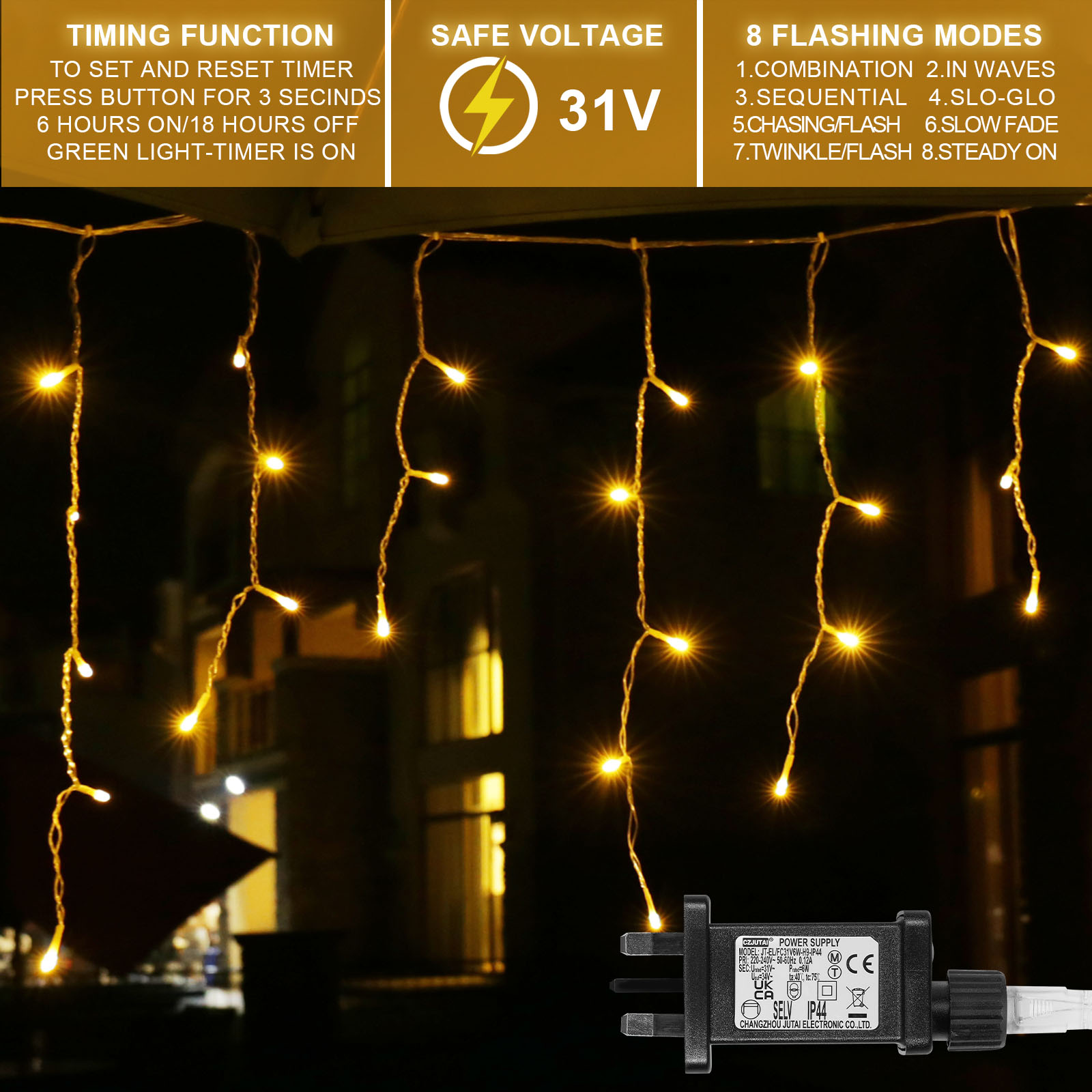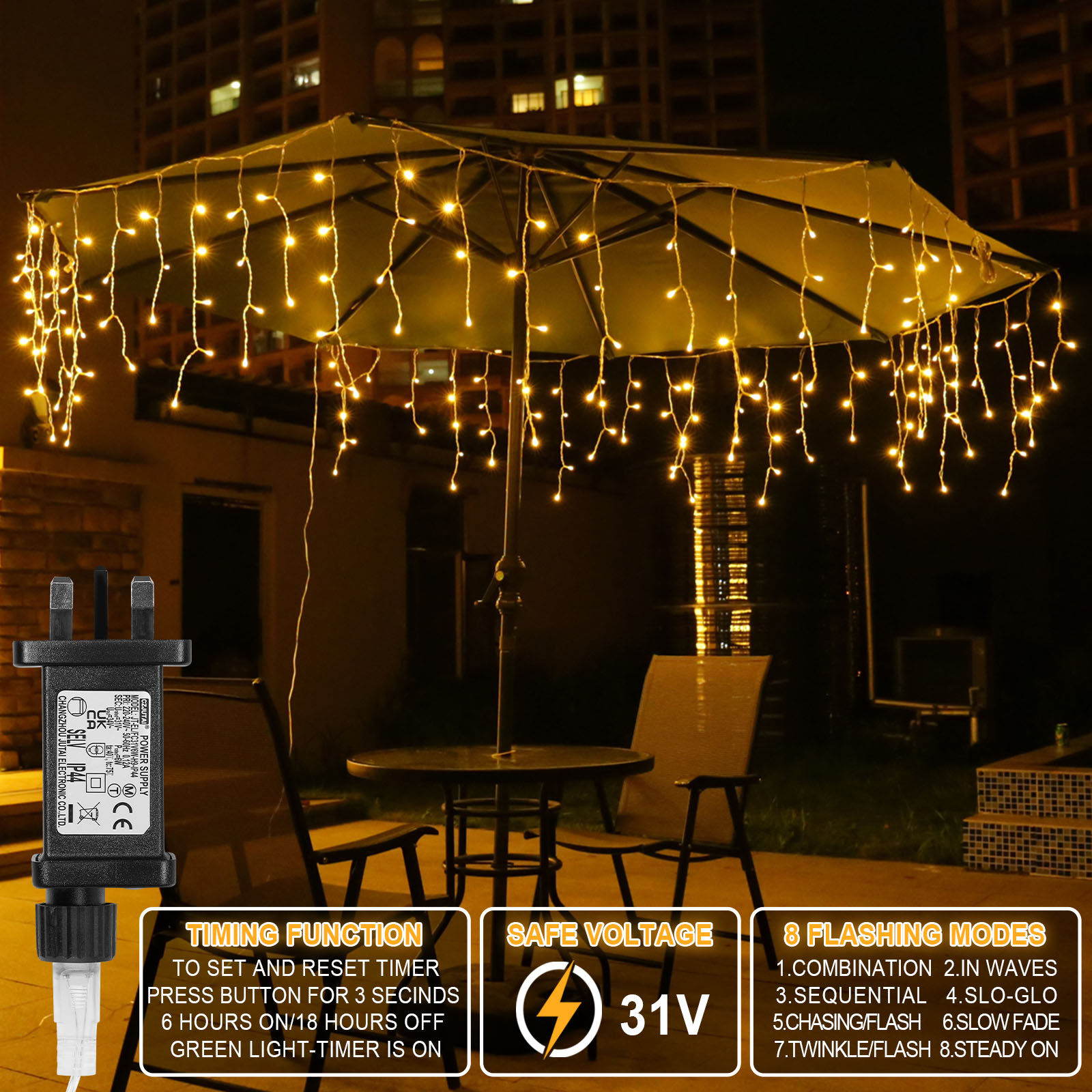 * Función de temporizador: las luces de cadena de carámbanos vienen con función de temporizador: 8 horas encendidas y 16 horas apagadas.Mantenga presionado 3 segundos hasta que se encienda la iluminación verde del botón, lo que significa que el temporizador está activado; Si la luz verde está apagada significa que el cronómetro está inactivado.
