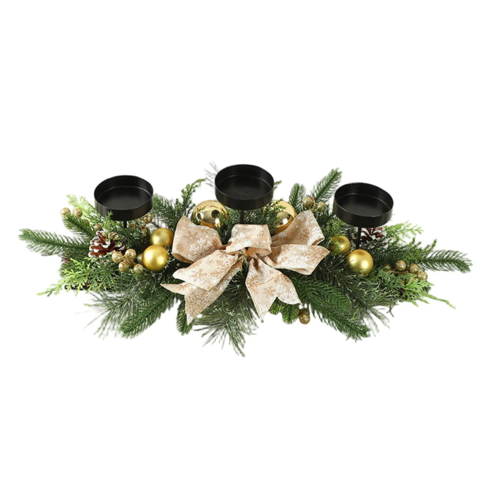 El diseño del candelabro de tres patas es ingenioso, con tres patas estables que sostienen todo el cuerpo.Sus líneas suaves y elegantes añaden un encanto vintage al candelabro.En la superficie del candelabro hay elementos navideños clásicos como copos de nieve, campanas, estrellas, etc.se presentan a través de tallados finos o meticulosas técnicas de pintura, y cada detalle es realista, lo que hace que las personas no puedan resistir la parada y la admiración.Una corona de vid rodea el fondo del candelabro, con enredaderas de tejido apretado adornadas con frutos rojos, conos de varias formas y lazos de cinta dorada.Las bayas rojas simbolizan y los conos aportan naturaleza natural, y las cintas doradas añaden un toque de esplendor, creando una atmósfera navideña animada y extraordinaria que complementa el candelabro de tres patas.